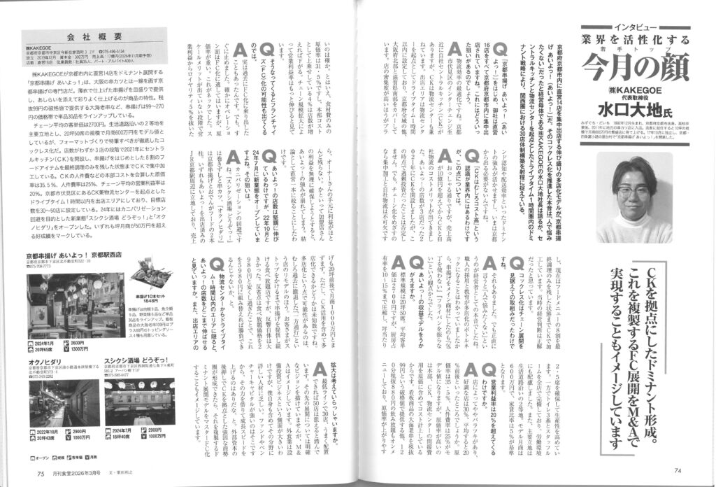 この度、外食産業の専門誌として最も歴史ある『月刊食堂』(柴田書店)2026年3月号にて、弊社代表 水口大地のインタビュー記事をご掲載いただきました。
